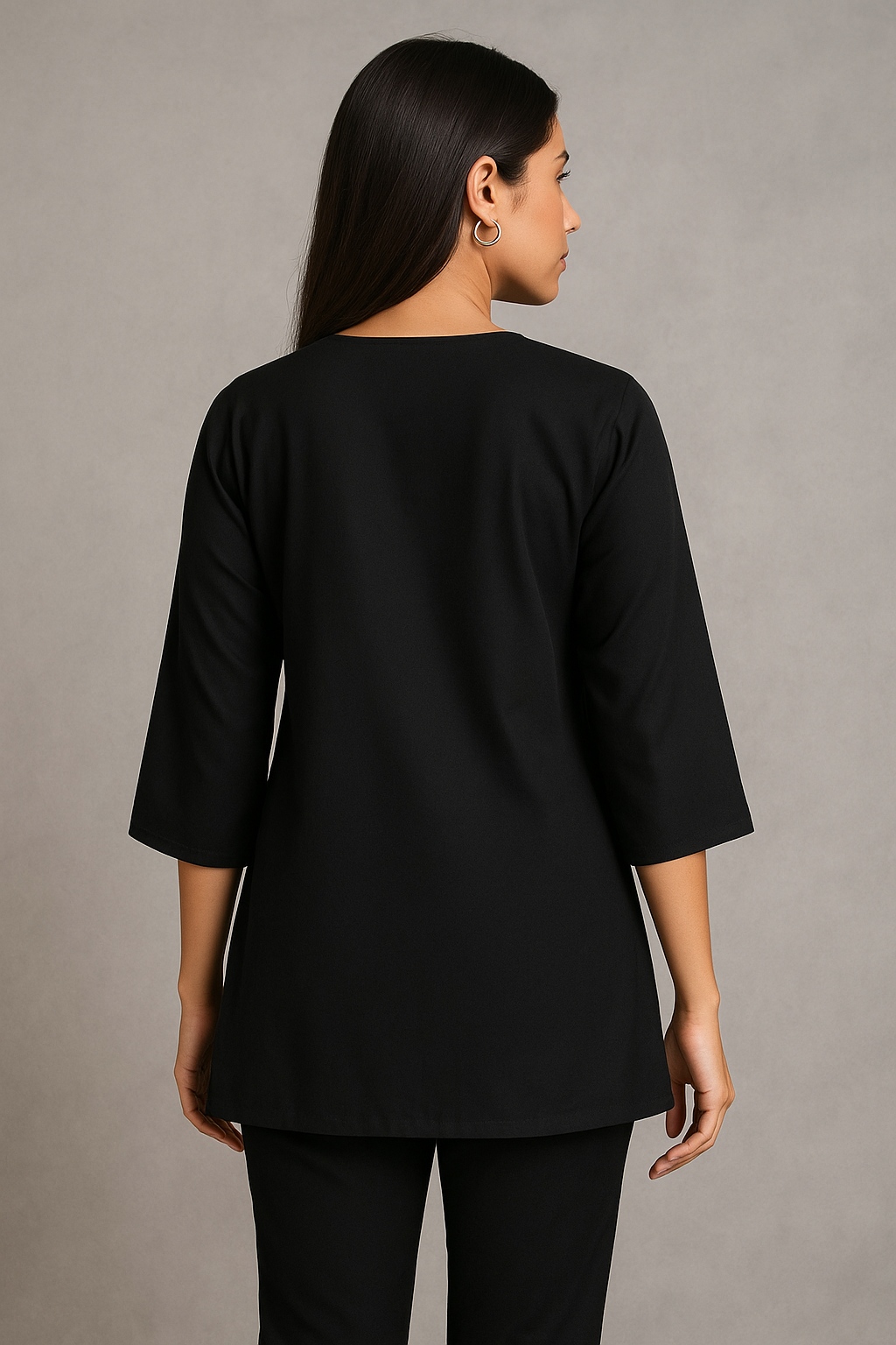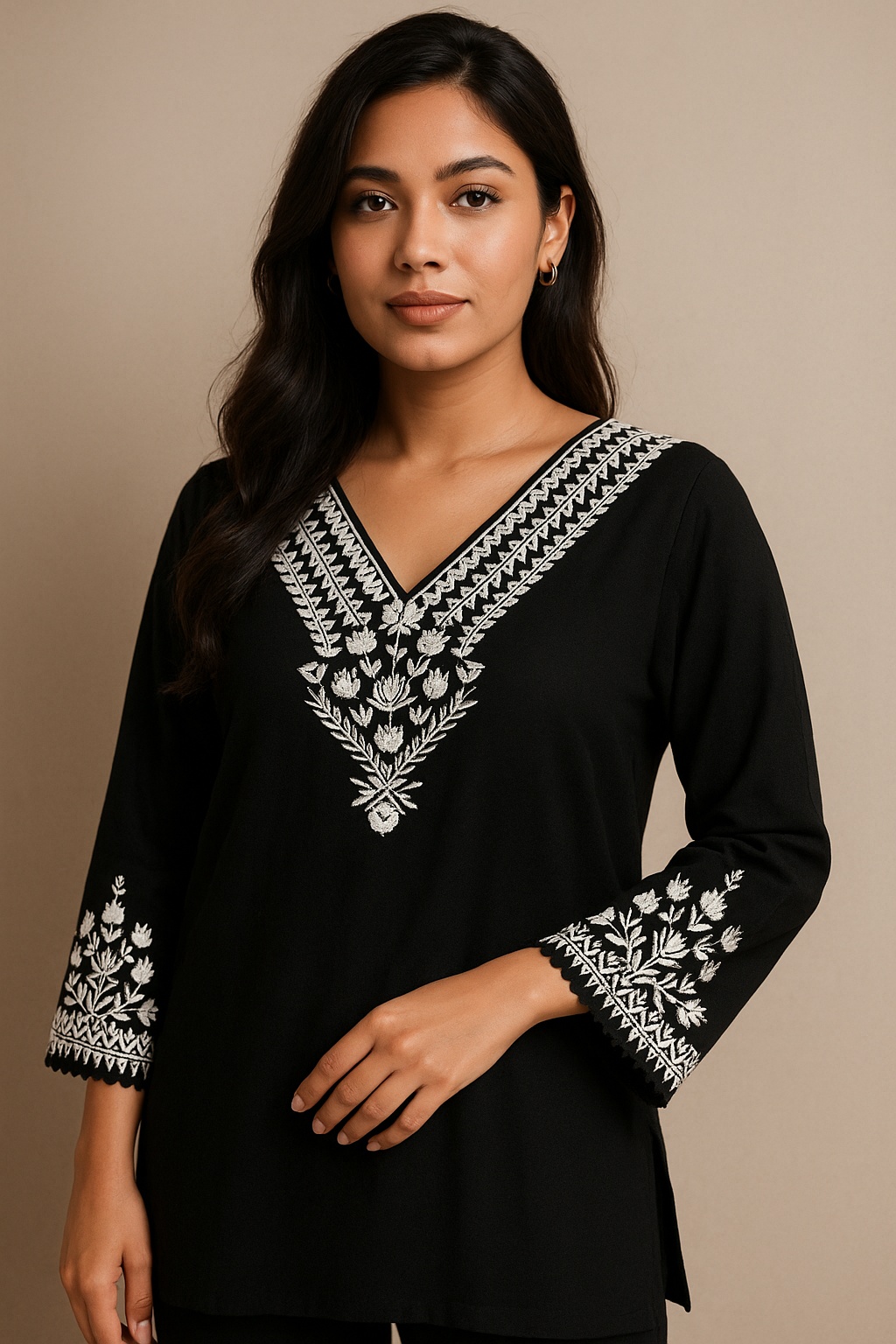 A stylish cotton flex embroidered kurta featuring a flattering V-neckline and elegant floral threadwork on the yoke and sleeves. Available in classic black and graceful off-white, this versatile kurta is perfect for both casual outings and festive gatherings.