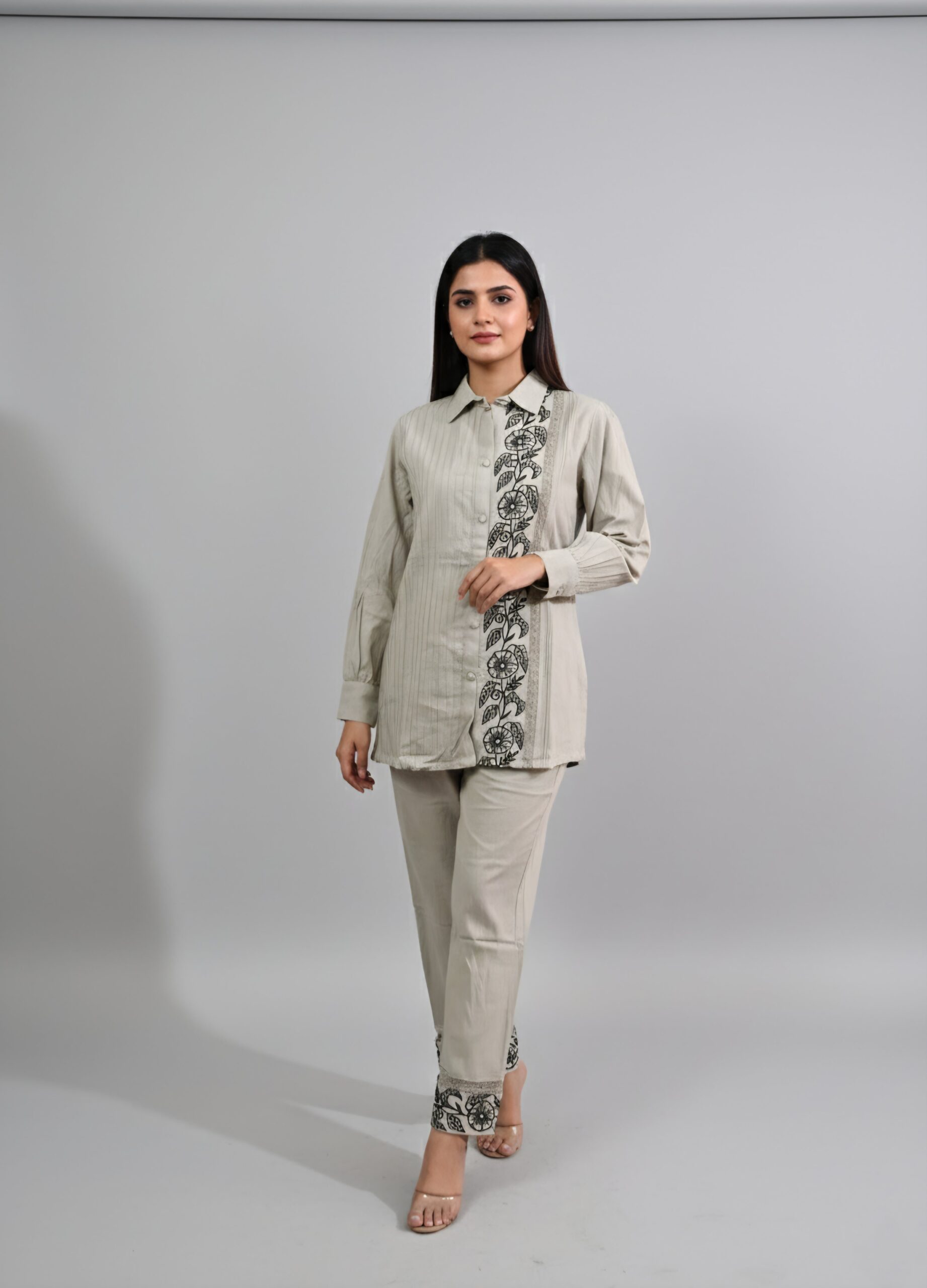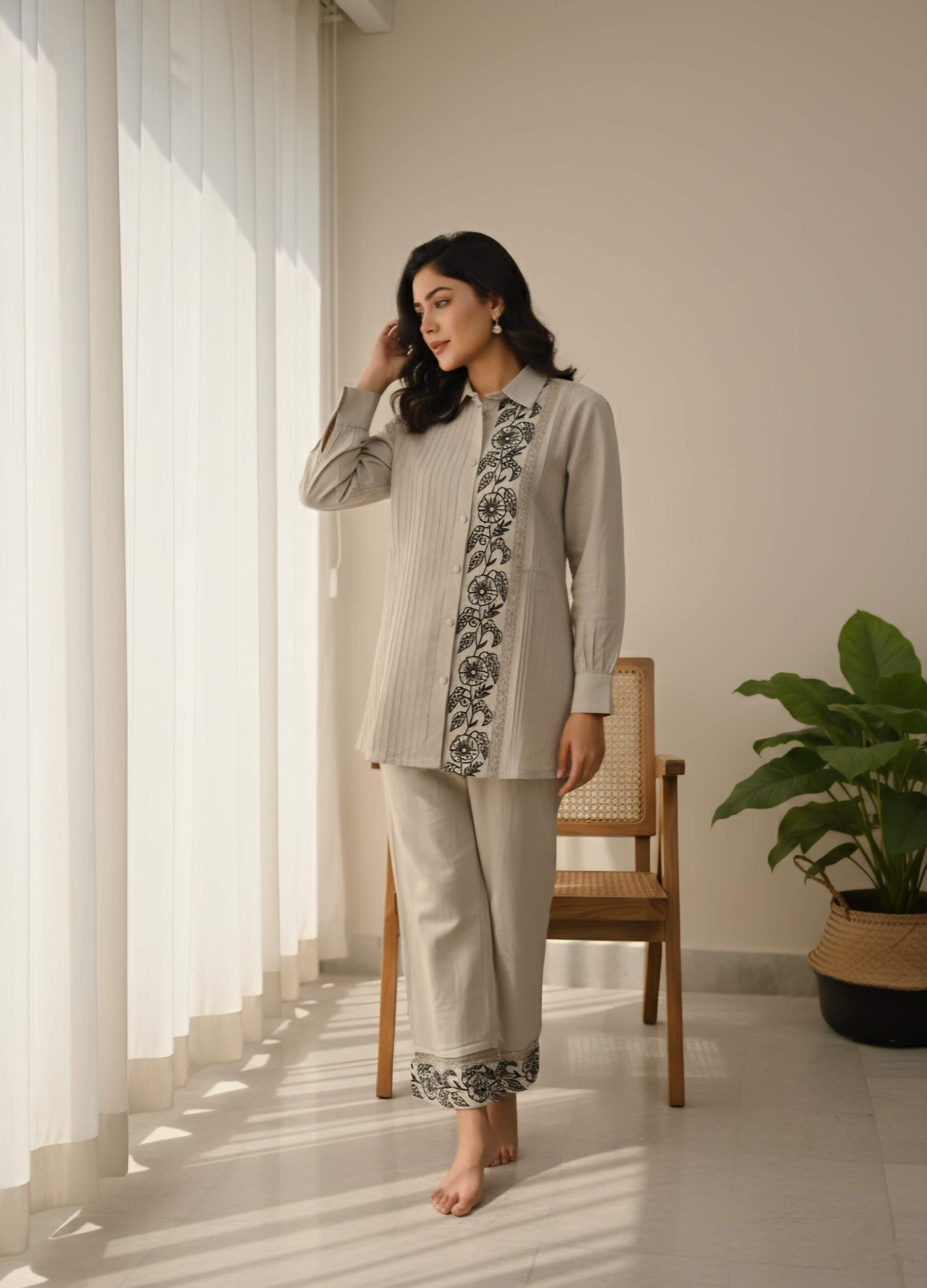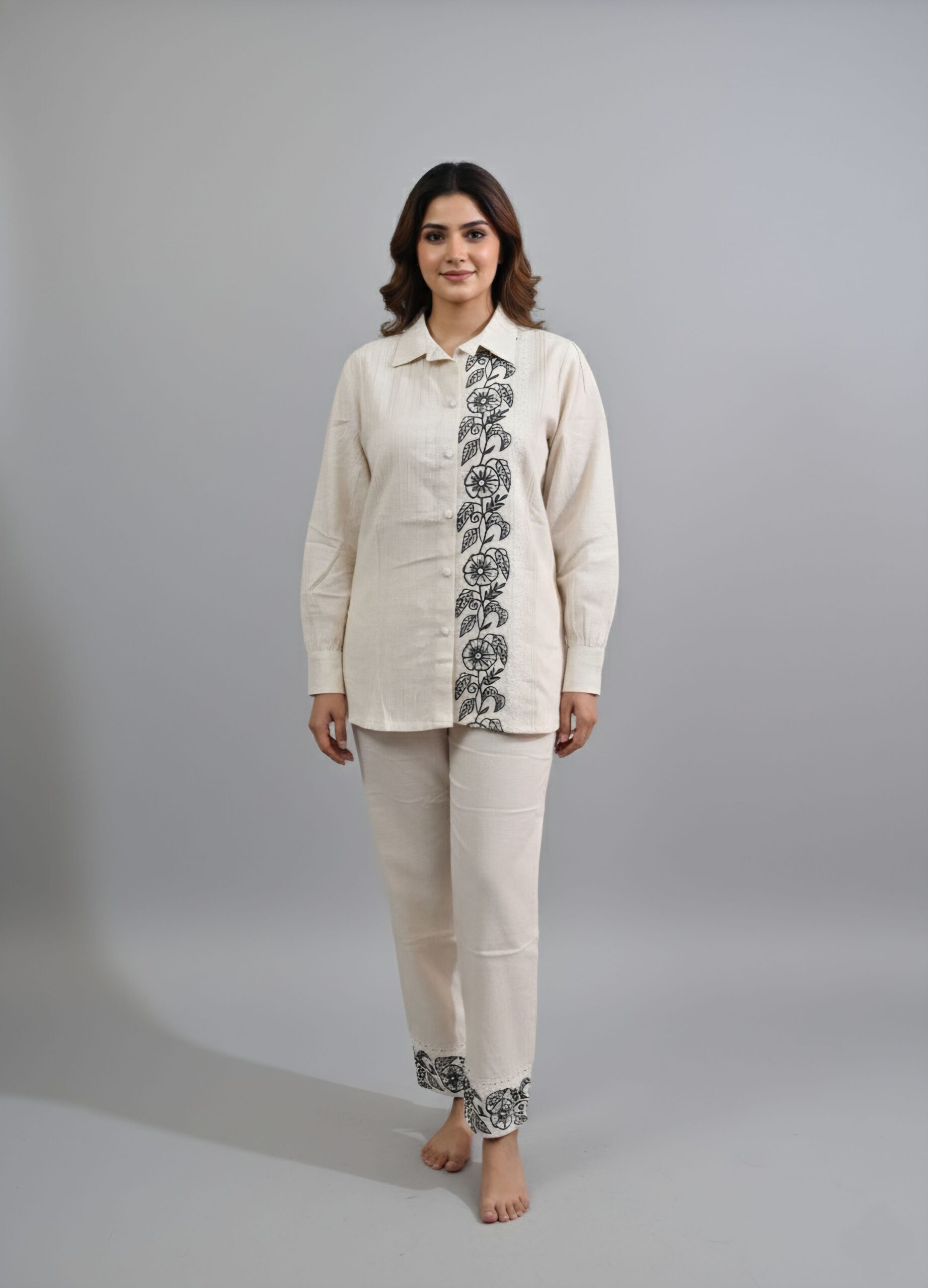 This set features a sophisticated collared design paired with matching elegant trousers. The top is beautifully detailed with delicate pintucks and a stunning floral vine embroidery that runs down the front. This same intricate trim is also found on the trouser hems, creating a perfectly polished and harmonious look.