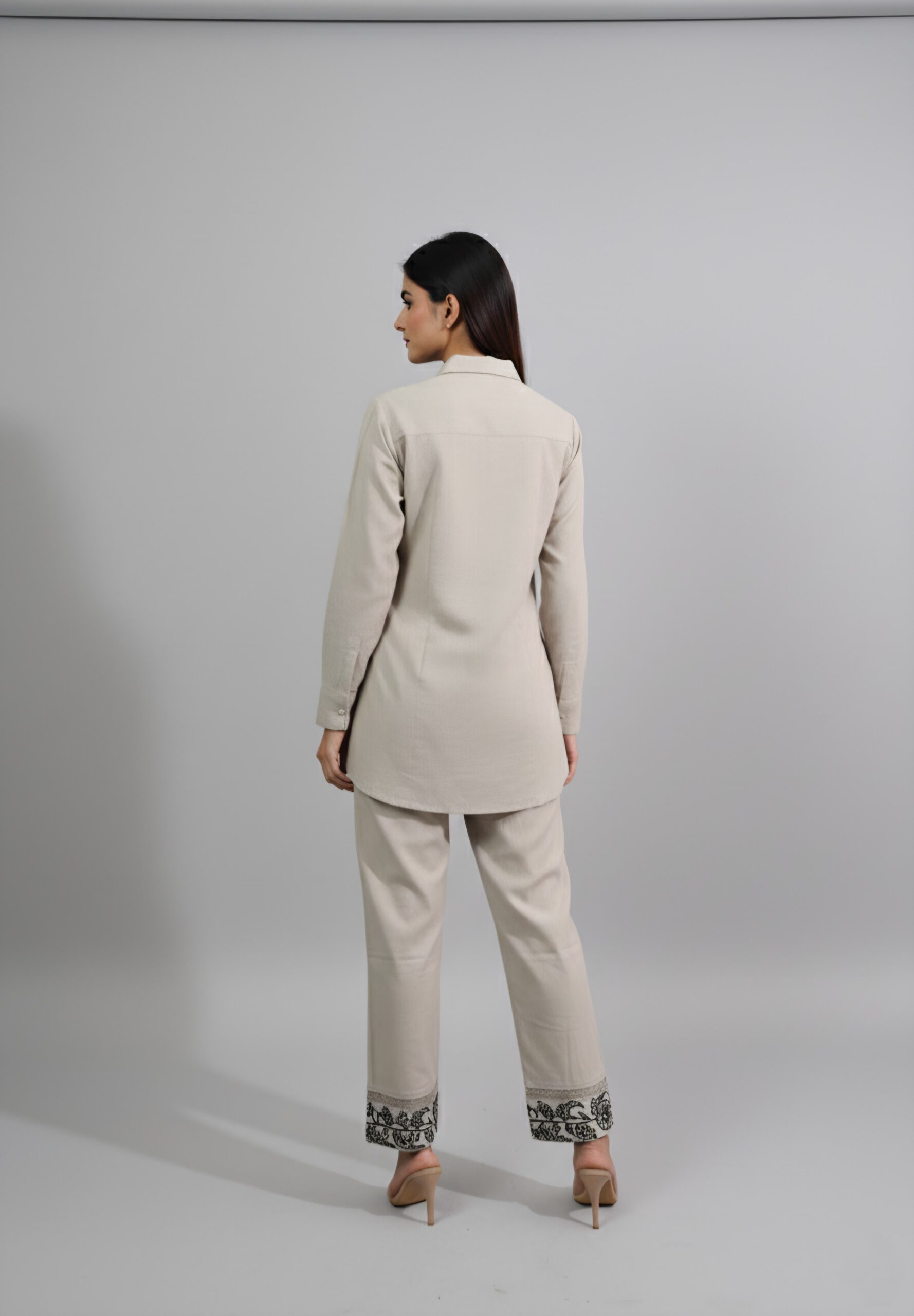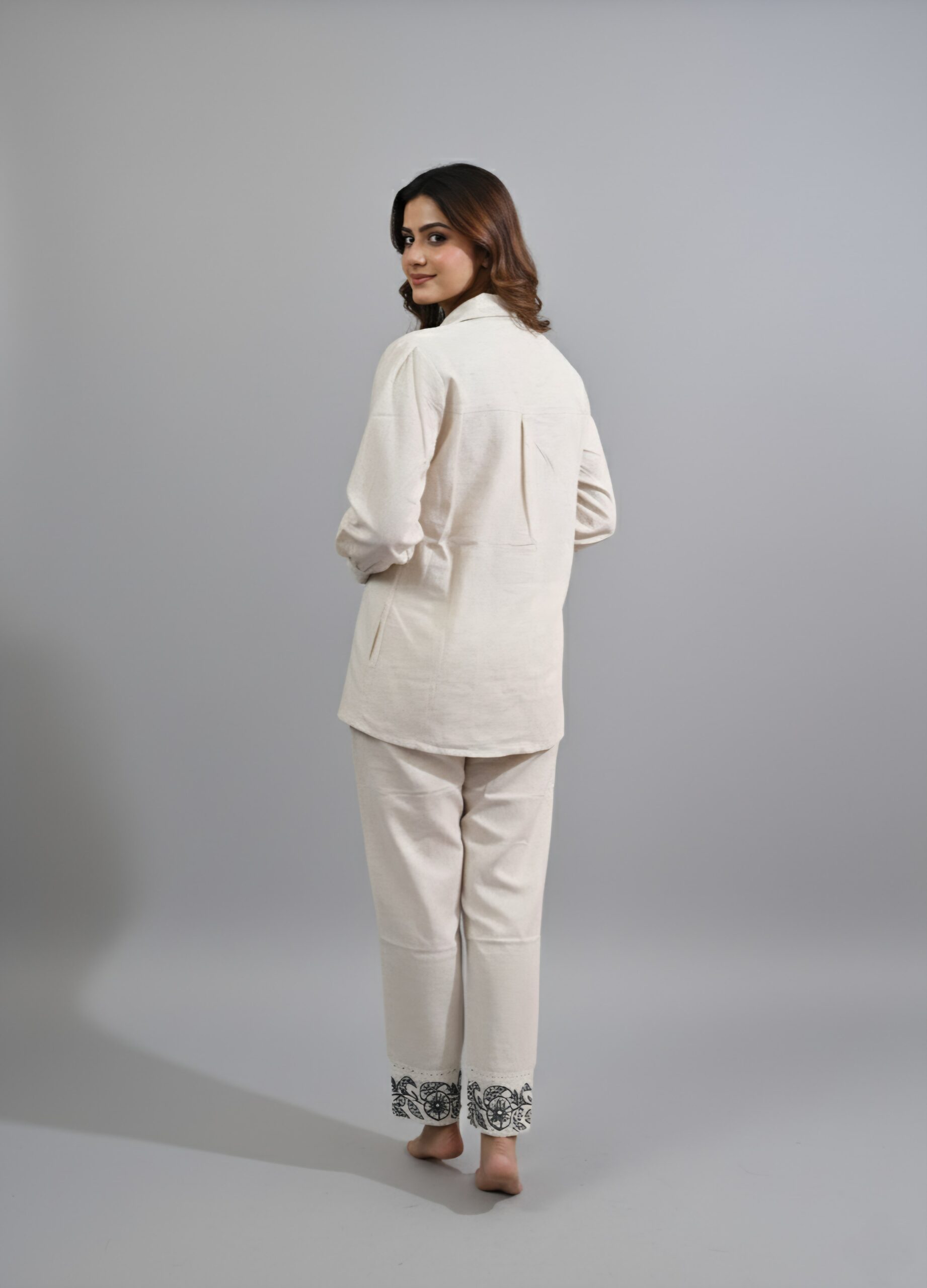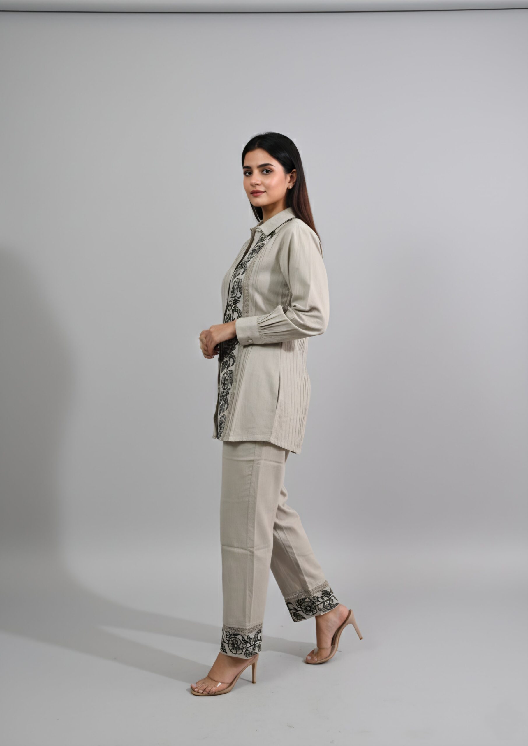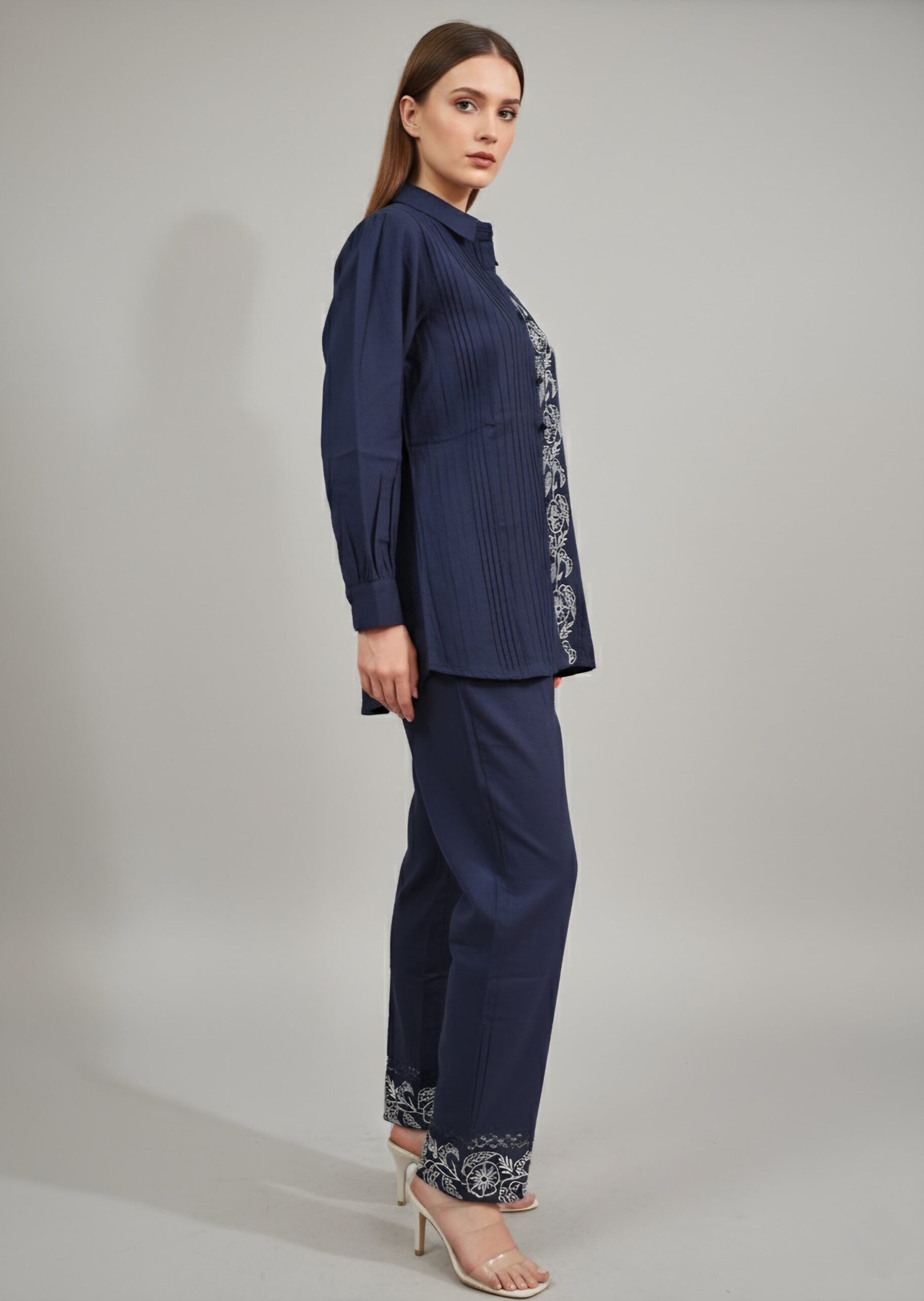 This set features a sophisticated collared design paired with matching elegant trousers. The top is beautifully detailed with delicate pintucks and a stunning floral vine embroidery that runs down the front. This same intricate trim is also found on the trouser hems, creating a perfectly polished and harmonious look.